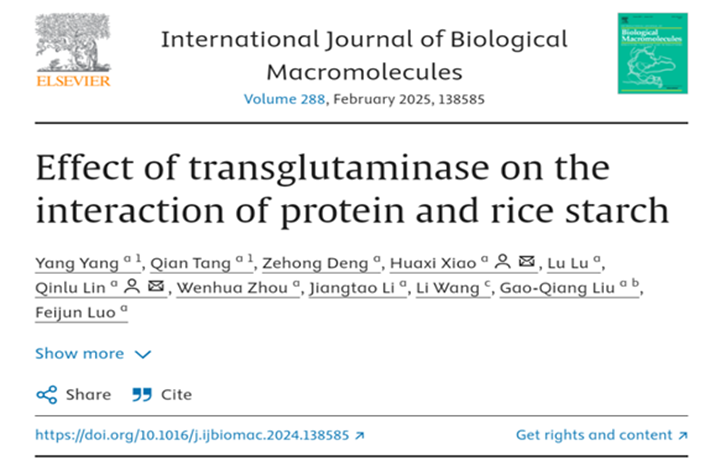 2024年12月9号,必赢林亲录教授团队在国际食品Top期刊International Journal of Biological Macromolecules(Q1, IF2023=7.7)在线发表题为“Effect of transglutaminase on the interaction of protein and rice starch”的研究性论文。必赢2023级硕士研究生阳扬为第一作者,林亲录教授和肖华西教授为共同通讯作者。