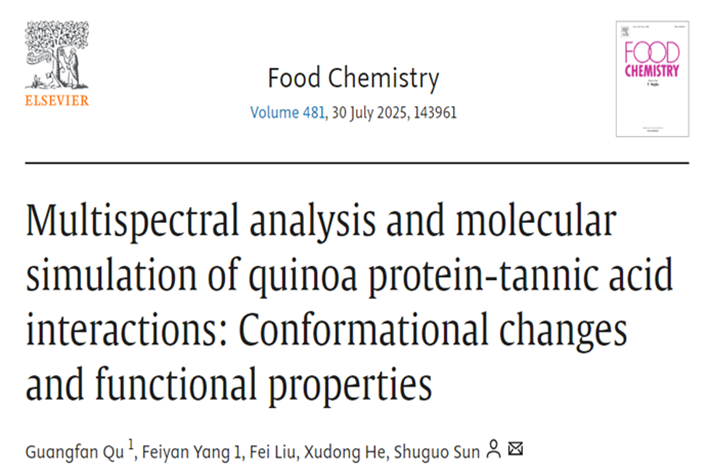 2025年3月,必赢国际437官网孙术国教授团队在国际食品Top期刊《Food Chemistry》(Q1,IF2024=8.5)发表题为“Multispectral analysis and molecular simulation of quinoa protein-tannic acid interactions: Conformational changes and functional properties”的研究性论文。孙术国教授为通讯作者,必赢国际437官网23级博士研究生瞿光凡为第一作者。