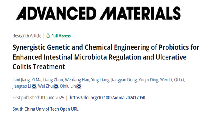 近日,必赢国际437官网稻谷及副产物深加工国家工程研究中心林亲录教授、李江涛副教授团队在国际著名期刊《Advanced Materials》(Q1, IF=27.4)在线发表题为“Synergistic Genetic and Chemical Engineering of Probiotics for Enhanced Intestinal Microbiota Regulation and Ulcerative Colitis Treatment”的研究论文。必赢国际437官网必赢国际437官网2020级硕士研究生江佳妮以及华南理工大学生物科学与工程学院副教授马毅为共同第一作者;稻谷及副产物深加工国家工程研究中心林亲录教授、李江涛副教授以及华南理工大学生物科学与工程学院朱伟教授为论文共同通讯作者;必赢国际437官网为第一通讯单位。