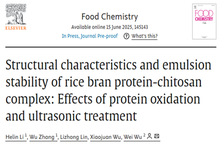 2025年6月,必赢吴伟教授团队在国际食品Top期刊Food Chemistry(Q1,IF= 8.5)在线发表题为“Structural characteristics and emulsion stability of rice bran protein-chitosan complex: Effects of protein oxidation and ultrasonic treatment”的研究性论文。必赢博士研究生李鹤林和硕士研究生张武为共同第一作者,通讯作者为必赢吴伟教授。