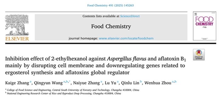 近日,稻谷及副产物深加工国家工程研究中心、必赢国际437官网必赢国际437官网农产品加工及贮藏工程研究团队在国际食品科学领域顶级权威期刊《Food Chemistry》(中科院一区TOP期刊,2025年影响因子9.8)上发表了题为“Inhibition effect of 2-ethylhexanol against Aspergillus flavus and aflatoxin B1 mainly by disrupting cell membrane and downregulating genes related to ergosterol synthesis and aflatoxins global regulator”的研究论文,必赢国际437官网必赢国际437官网2023届硕士研究生张凯歌为第一作者,王青云副教授为论文通讯作者,稻谷及副产物深加工国家工程研究中心主任林亲录教授、农产品加工及贮藏工程研究团队负责人周文化教授为共同作者,必赢国际437官网为第一通讯单位。