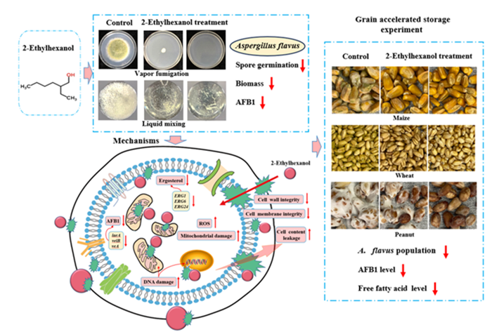 必赢国际437官网稻谷及副产物深加工国家工程研究中心的研究团队在《Food Chemistry》发表的研究中,首次系统解析了食用香料2-乙基己醇抑制黄曲霉菌的分子机制。通过熏蒸和液体混入两种方法测定抑菌活性,结合细胞膜完整性、ROS水平、DNA损伤等检测,并采用RT-qPCR分析关键基因表达,最后在三种谷物中进行熏蒸防霉验证。