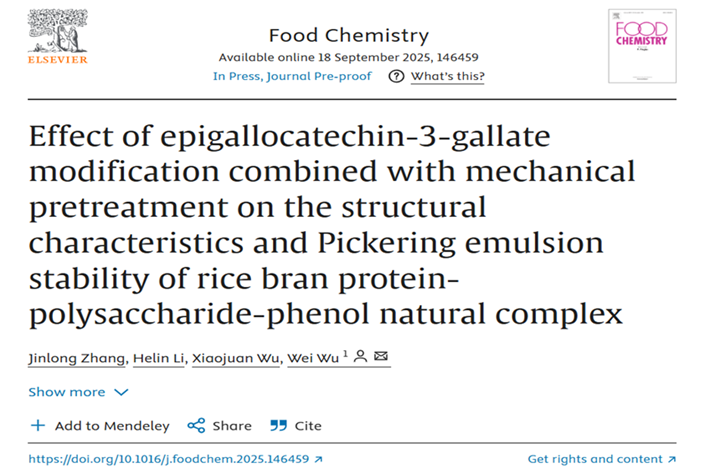 2025年9月18日,必赢吴伟教授团队在国际食品Top期刊Food Chemistry(Q1,IF= 9.8)在线发表题为“Effect of epigallocatechin-3-gallate modification combined with mechanical pretreatment on the structural characteristics and Pickering emulsion stability of rice bran protein-polysaccharide-phenol natural complex”的研究性论文。必赢2023级硕士研究生张金龙为第一作者,通讯作者为稻谷及副产物深加工国家工程研究中心吴伟教授。