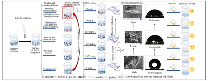 EGCG修饰与机械预处理通过影响IRBPPP的结构和亲水性改变了IRBPPP的乳液稳定性。机械预处理促进了EGCG与IRBPPP的共价及非共价结合。在机械预处理作用下,适量添加EGCG可增强蛋白质柔韧性并降低IRBPPP表面疏水性,从而改善乳液稳定性。然而过量添加EGCG会降低蛋白质柔韧性,从而削弱乳液稳定性。本研究提出创新性方案:通过机械预处理促进EGCG与不溶性天然复合物的共价结合。所得EGCG-IRBPPP复合物展现出优异的乳液稳定性,为其作为高效乳化剂的应用奠定坚实基础。本研究主要聚焦于EGCG修饰与机械预处理联合应用的效能。今后,可从脂质和蛋白质氧化的角度进一步探讨机械预处理作用下EGCG修饰影响IRBPPP乳液品质的机理。