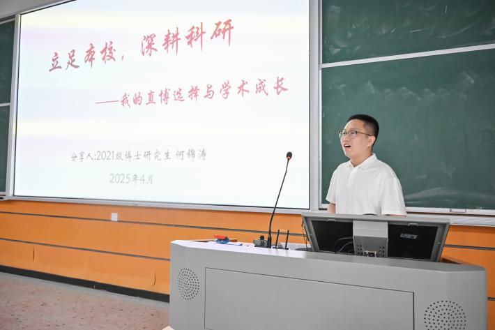 会上,杨桥、何景涛、穆岚依次上台分享。2020级博士研究生杨桥和2021级博士研究生何锦涛结合自身经历,展示了各自科研领域的研究成果,分别从直博的方面分享了本校的读研优势,讲述了三种考研方式的特点。他们鼓励同学们找到感兴趣的研究方向并坚持自己的研究,建议同学们通过与学院老师面对面交流,选择适合自己的导师和研究方向。本科生代表穆岚则分享了自己考研调剂的经历,并详细介绍了调剂流程,指出本校调剂的优势。她鼓励同学们明确目标,制定合理计划,无论是第一志愿还是调剂,都要享受考研过程,积极争取上岸机会。